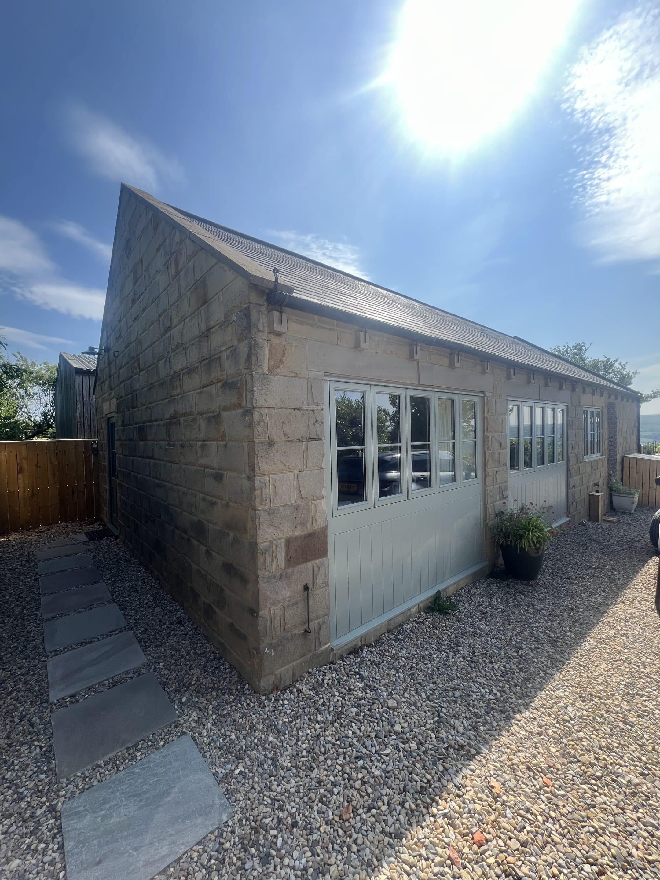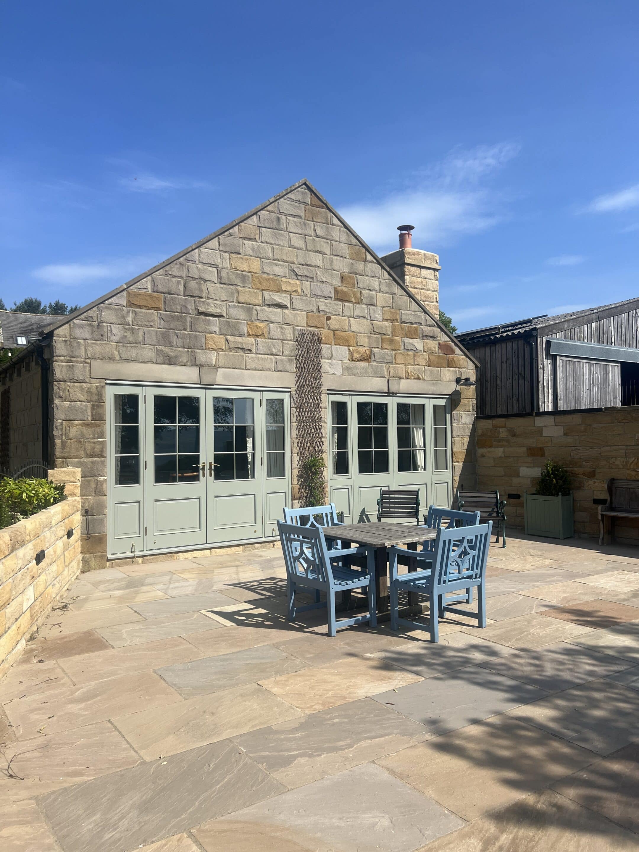 Externally, we created a beautiful patio area using Indian stone paving slabs, complemented by a sandstone wall. This outdoor space has been designed to maximise enjoyment of the stunning countryside views, offering a peaceful and functional area for relaxation.